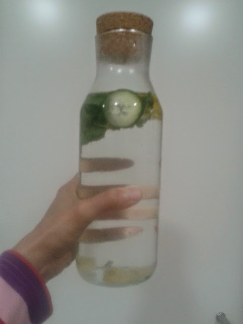 Com a entrada na escola mudei muito os meus hábitos alimentares e não foi para melhor... Comecei a comer mais, com intervalos mais espaçados e também a ingerir mais gorduras e açúcares. O resultado foi ganhar alguns quilos e sentir-me desconfortável,  principalmente devido ao inchaço abdominal. Agora ao fim de uns meses estou finalmente a aprender a comer melhor mesmo quando estou sempre rodeada de comida mas também truques que me fazem sentir melhor. Um deles é esta água aromatizada. Dizem que a combinação dos ingredientes é ultra detox. Não sei se será ou não, mas que me faz sentir bem lá isso faz! Além disso é deliciosa e sabe super bem beber esta água fresquinha pela manhã!